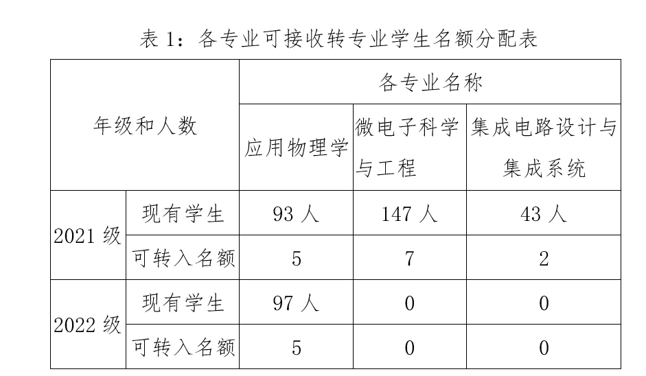 各专业可接收学生的名额一般不超过当年级专业学生人数的5%,具体名额分配见表1。