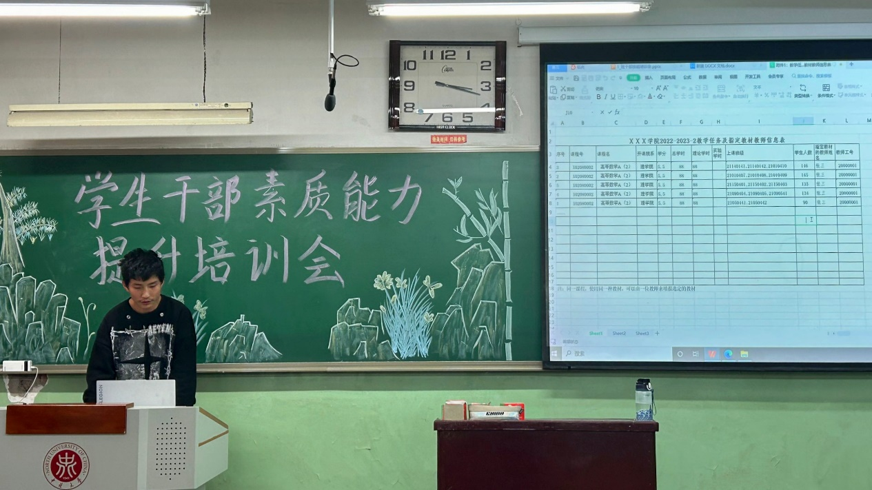新媒体副部阳佩霖同学上台分享Word文档使用心得。其讲解和演示了Word软件使用技巧,并介绍了日常工作中的要求。现场演示和互动进一步增强了学习效果。并提醒可能的犯错点,增强了学习效果。其次是由青志部副部闫锦波同学分享了PPT和Excel的功能应用。在Excel的介绍中,要如何制作一份表格。并示范了打印的操作。以及讲解了如何计算多个单元格的和,利用函数求各个单元格的平均值,总和等等。最后进行了提问并现场讲解。最后闫锦波同学对PPT的操作进行了分享,其简述了PPT在大学生活中的重要性。讲解了PPT的构成以及在制作过程中需要注意的问题,并且强调了主讲人讲述对于PPT的影响。最后讲解了当进行汇报讲演时,因紧张而导致忘记所要讲讲述的内容,要如何解决,并邀请同学上台进行操作展示。