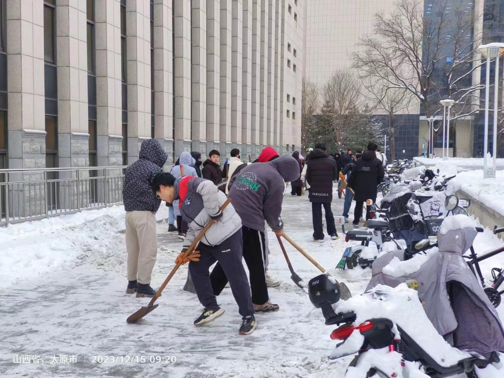 近日普降大雪,校园内积雪情况较为严重,为响应学校号召,保障道路畅通和广大师生的出行安全,维护学校正常教育教学秩序,创建一个安全、整洁的校园环境,2023年12月15日上午,Fun88乐天堂
