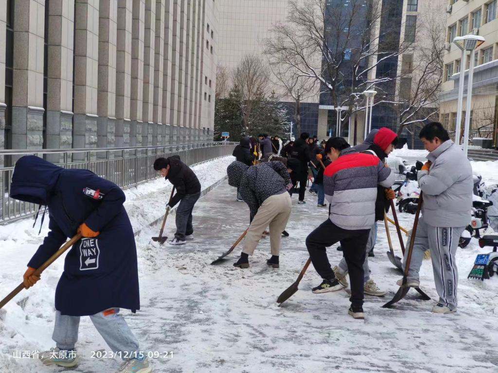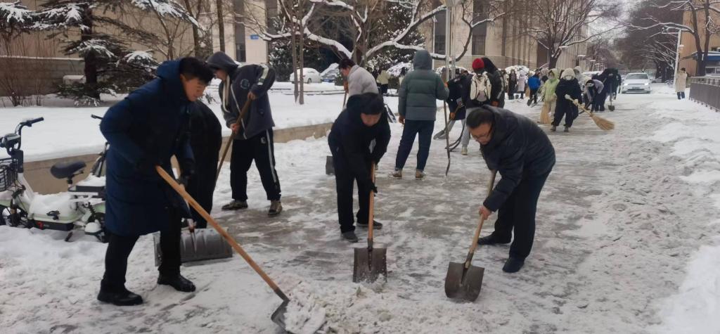 五十余名师生党员共同参与铲雪除冰行动。大家在零下十几摄氏度的寒风中齐心协力,手持铁锹、扫帚等工具,迅速投入到铲雪除冰的工作中。