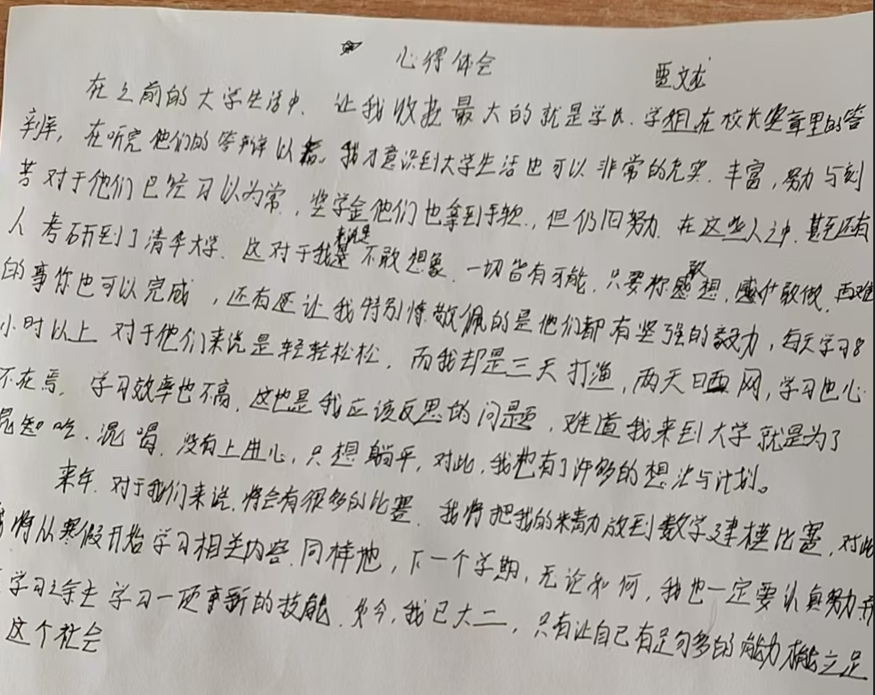 本学期学业导师崔文丽老师组织23级帮助成长的5名同学(2319014234赫宇、2319014214杨嘉显、2319014217曹瑞洲、2319014235马榕谦、2319014223贾文龙)召开了线上视频会议,积极了解学生学习与生活的基本情况,并要求他们提交了有关学习方面的所思所想,具体提交素材如下: