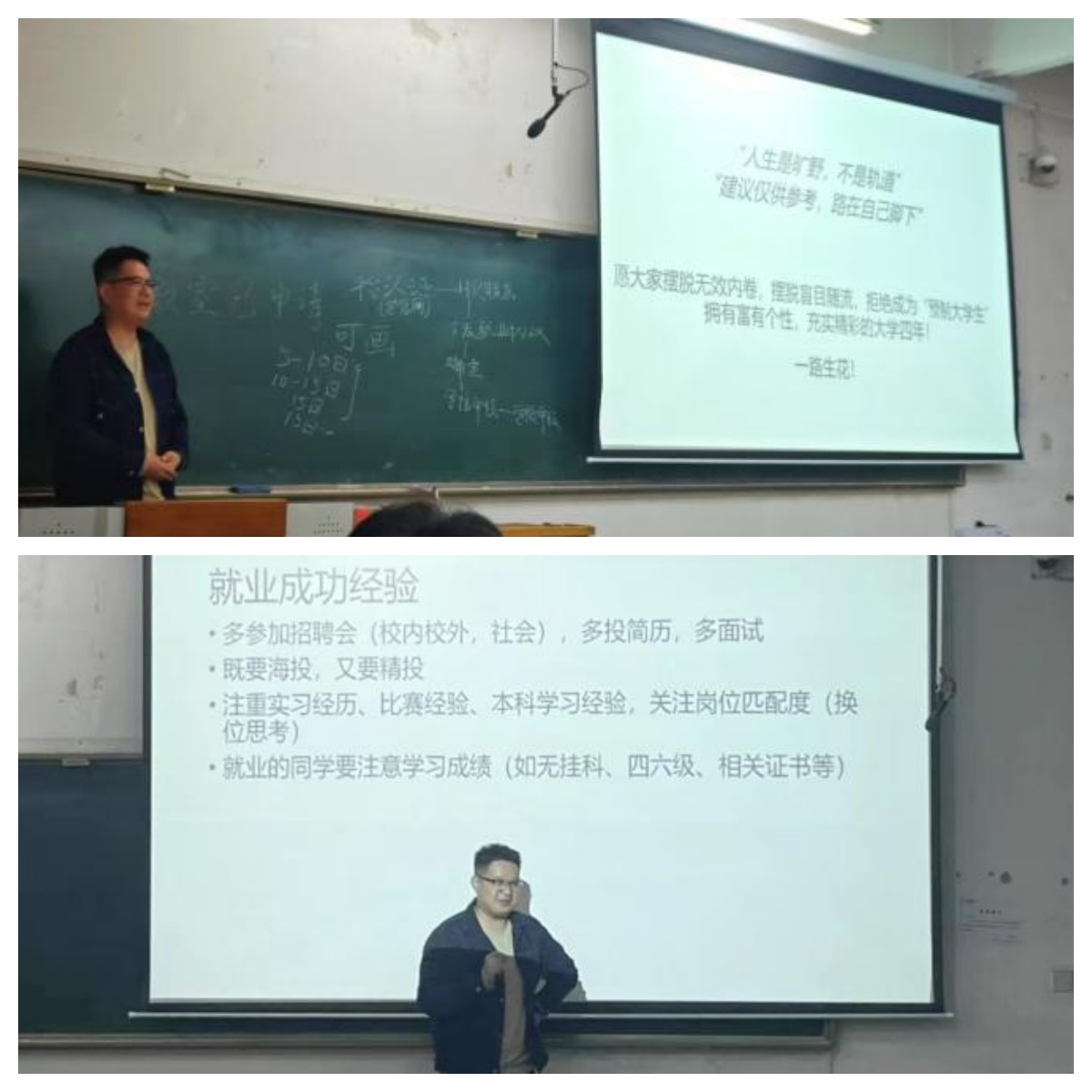 随后,王嘉和为同学们介绍了求职信息的获取及就业手续的办理流程。他鼓励同学们在春招中把握节奏,坚定信心,稳定求职心态。结合自身经历,王嘉和展示了求职和考研中的关键要点,鼓励同学们积极谋划求职路线,明确职业目标,不断提升综合能力,勇敢面对求职挑战。他以“青春是未写完的简历,每一笔都算数”为结尾,鼓励大一同学珍惜大学时光,过出精彩生活。