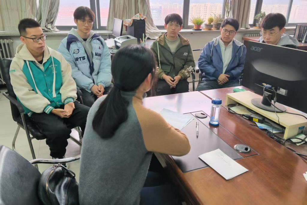 2025年2月28日,杨艳老师与23级微电子专业学生张志翔、荣泽、田贺允、胡航宇和王超在9号教学楼820办公室进行了新学期首次见面,主要了解上学期同学们的学业情况,对于成绩不理想的同学进行单独沟通与交流,及时发现问题并尽力解决。鼓励优秀的学生分享学习经验与方法、大家彼此借鉴。大二学生应通过参各类学科、创新创业竞赛及生产与社会实践活动,丰富阅历、锻炼与提升自己的综合素养。了解学生的学业目标,关于保研、考研、考公及就业的初步想法,根据目标制定学习计划,提高学习效率;鼓励大家积极备考CET4。